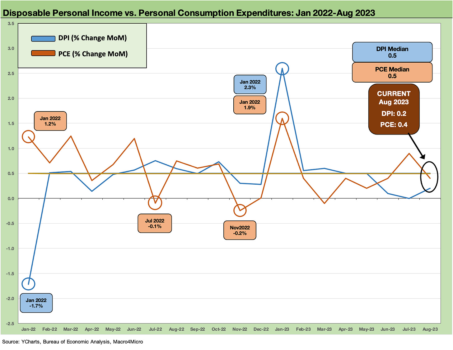 The above chart starts in 2019 and runs across the MoM changes in Disposable Personal Income (DPI) and Personal Consumption Expenditures (PCE). DPI is softening MoM vs. 1Q23 and April-May despite the headlines on wages broadly. We see a soft streak the past 3 months on DPI. At +0.4%, PCE is down sequentially from a strong July (+0.9%) and well below the high of Jan 2023 of +1.6%. We see a few others at 0.4% scattered along the way. The PCE watch continues.