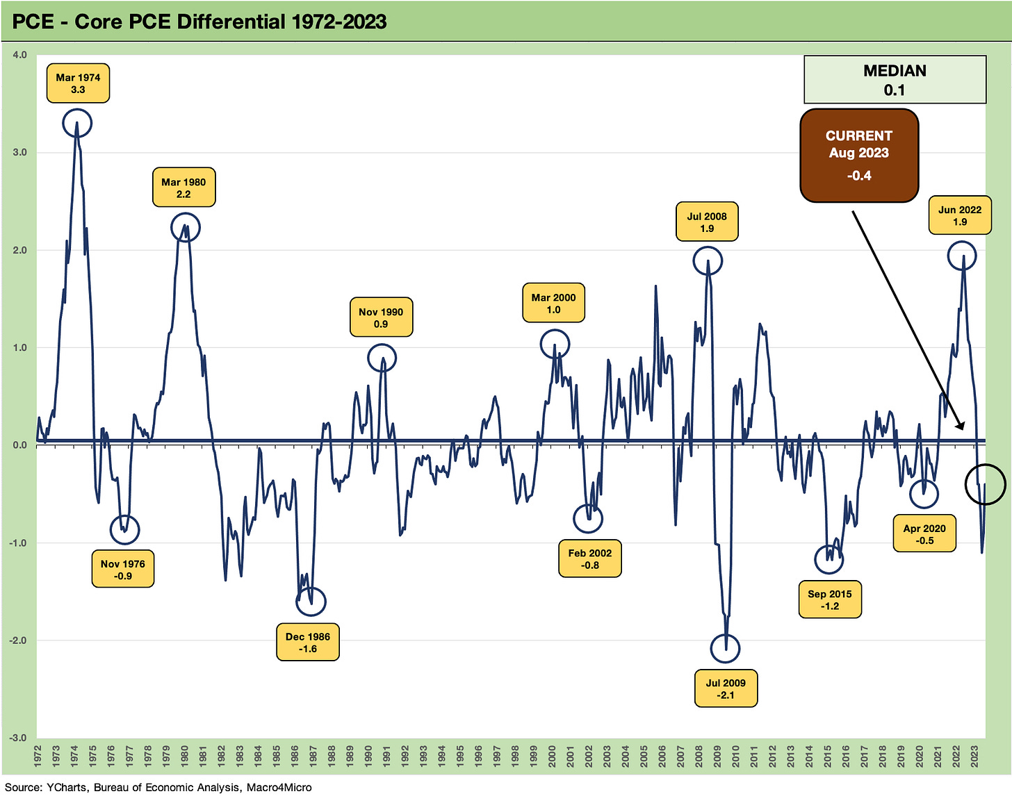 The above chart updates the long-term differential between Headline PCE and Core PCE inflation. Some of these differentials mean more to household budgets than to the macro modelers of the world. The big swings translate into only a small median differential.