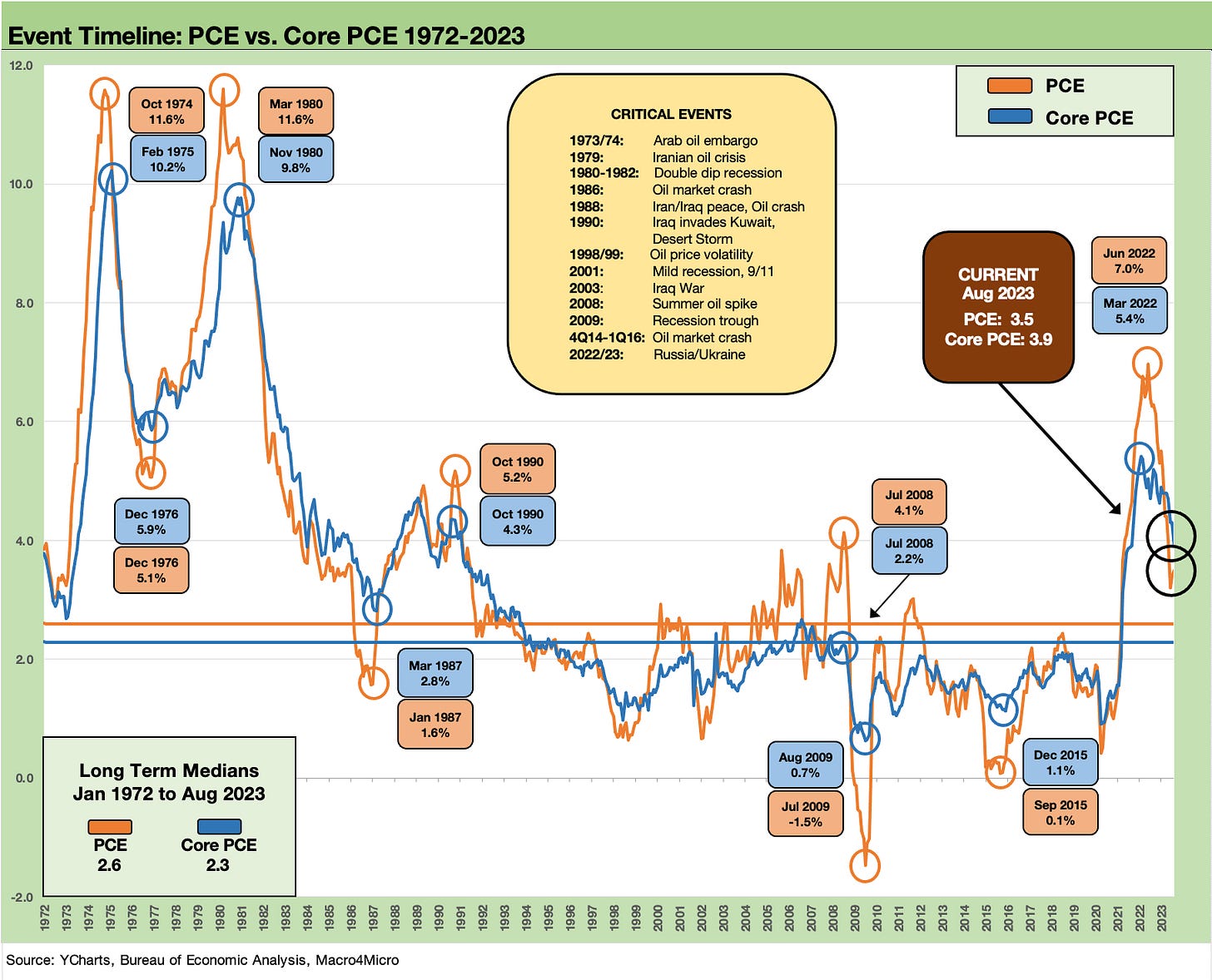 The above chart plots the time series for Headline PCE inflation and Core PCE from 1997. We also include the timeline from 1972 further below, but this one really hammers home the scale of the deviation in 2022-2023 from the TMT era and credit cycle peak through today. When we drop in the hideous stagflation years of 1973 through the 1980-1982 double dip in the longer timeline chart, the scale looks very different.