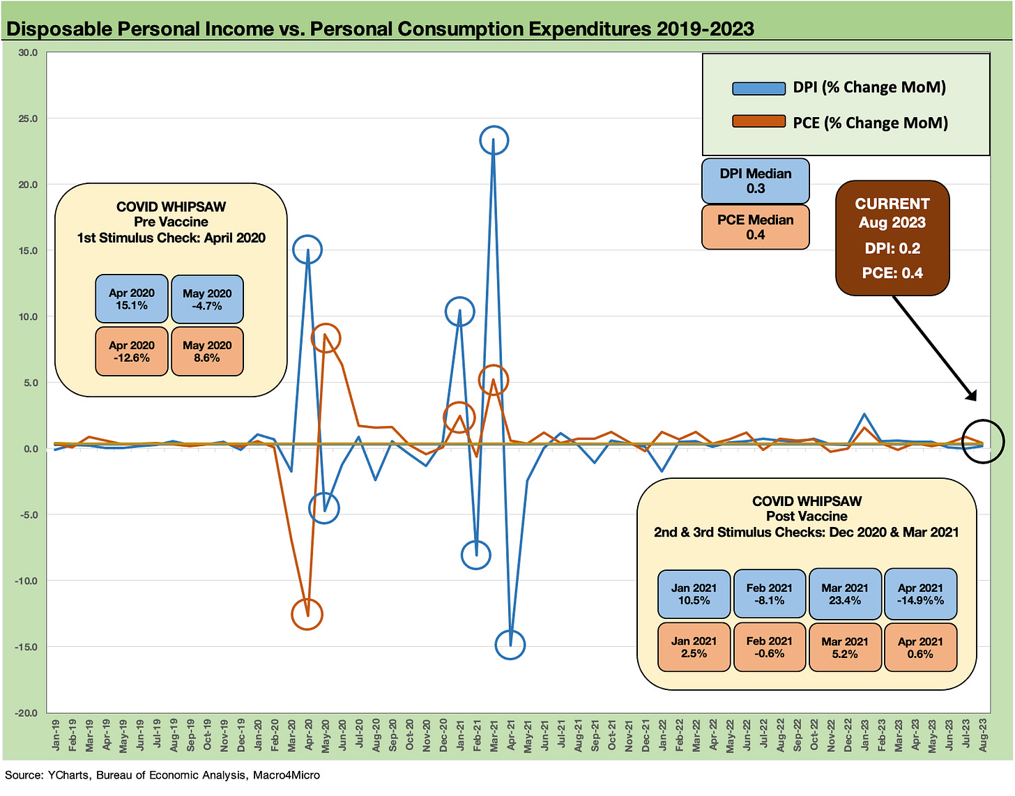 The above chart looks back across the monthlies for the DPI vs. PCE lines as a reference. When debates kick into gear around what the stimulus packages did or did not do, these numbers help (see Inflation Rorschach Test: Looking at Relief and Stimulus 2-7-23).