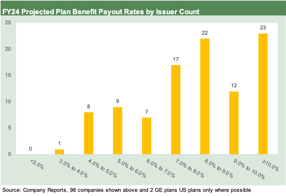 As we see in the chart at the top, the plans posted a heavy weighting in the 5% to 9% range for the payout rate with a cluster of plans needing to generate cash flows above the IG index par-weighted coupon of 4.1% and for many above the HY index par weighted coupon of 6.1%. The median plan in the overall population paid out 7.2% of assets in 2023 and are projected to pay out 8.4% in 2024. In the context of today’s yield curve, that is a hefty payout.