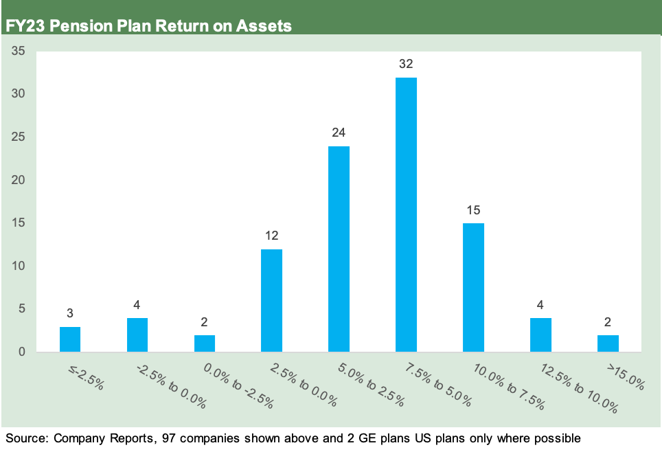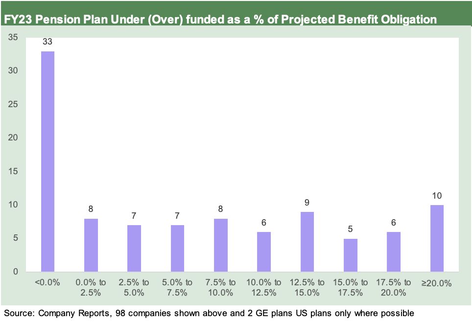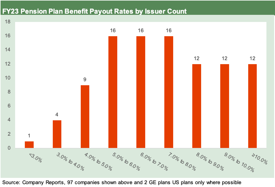 Forward pension plan drain rate for 2024: We look at the footnote disclosure for the forward pension benefit payments estimated for 2024 and compare that to ending plan assets for 2023. With such a material move in portfolio returns from 2022 to 2023, the 2024 version set against ending plan assets version is less daunting for many companies but still a major barrier for most.