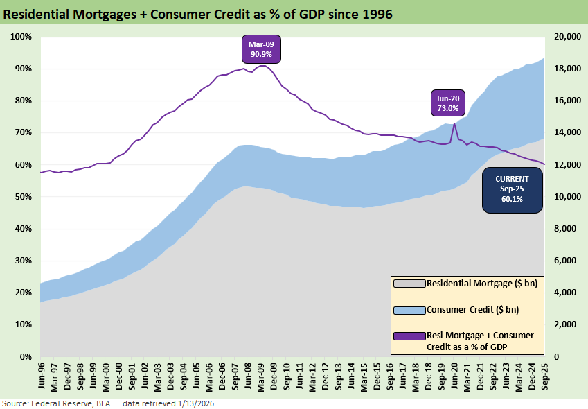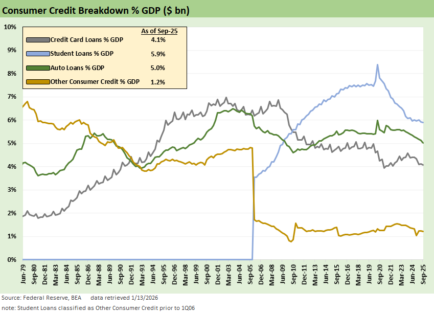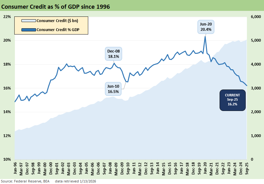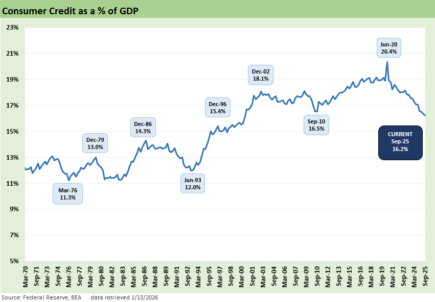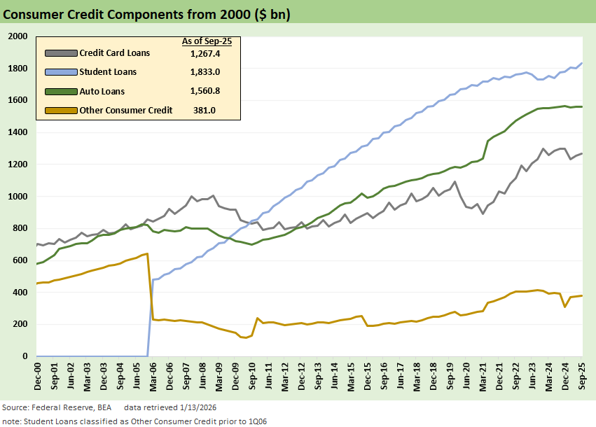 As an FYI, we use data from the Fed Z.1 reports. We also looked into updates from the monthly Fed G.19. Lending Tree also has very useful updates. We like using Synchrony (SYF) data as a useful pure play proxy with a very wide range of customers. SYF has customized products by subsector and developed networks such as in healthcare and home & auto among others (see Synchrony: Credit Card Bellwether 10-30-25). Synchrony will announce results on January 27. Card-heavy Capital One will release on January 22.