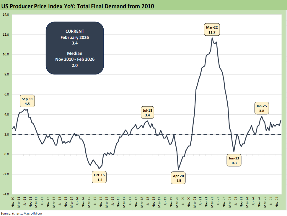 The above March 2022 chart updates the total Final Demand PPI from Nov 2010 to Feb 2026 with the latest Final Demand reading at +3.4% YoY. We see the sharp move higher in the post-COVID rebound running into widespread supply-demand imbalances into a March 2022 peak. For those who remember the obscene inflationary effects from commodities to used cars, there was a more complicated array of forces weighing in than political spin would suggest. We look at that policy-intensive period in detail in our PCE updates (see PCE Inflation Jan 2026: Personal Income & Outlays 3-13-26).