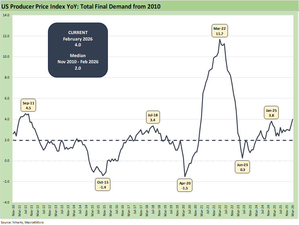 That +11.2% in March 2022 came with the start of the tightening cycle as PPI went on its journey to 3.3% by the end of Dec 2024. The current 4.0% in March 2026 is above the 3.3% PPI posted in Dec 2024 (Biden’s last full month in office).