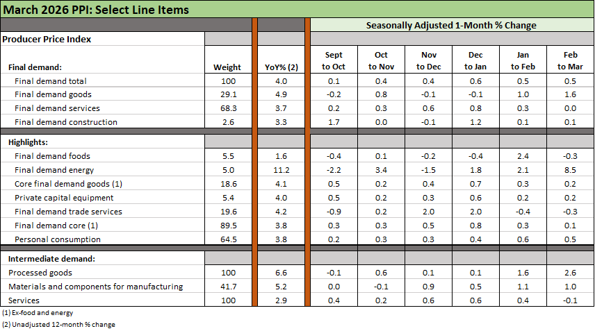The above table includes a subset of the recent trends on the main PPI lines we choose to focus on for signals. There is certainly no shortage of lines in the PPI release (numerous pages and many lines across Table 1 and Table 2) under various final demand and intermediate goods and services categories for YoY and MoM moves. We covered some of the main groups in the chart, but a scan of the columns in the release looking for outliers is always a good drill. We include some categories that carry lower weightings that are of interest in terms of what they reflect.
