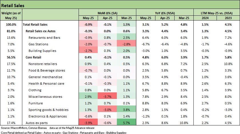 The slow slide following March’s tariff-driven pull-forward continued in May, with Retail Sales falling -0.9%. The combined effects of tariffs (whether based on economics or confidence) add up to largely flat with some of the major gainers in March contracting this month. A down month in May looks more like deceleration after a pull-forward effect. While not cause for panic yet, the underlying detail reveals growing cracks for the consumers for a still cautious consumer.