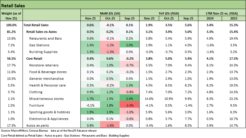 Outside the core mix, building supplies (+1.3%), autos ex-parts (+0.8%), and gas stations (+1.4%) all bounced back from weak October prints to bolster the headline reading. Overall, the headline is being helped by a mix of discretionary categories and gas rather than a broad-based surge. That matters as we look ahead to which trends will remain durable in 2026 once promotions and holiday effects roll off.