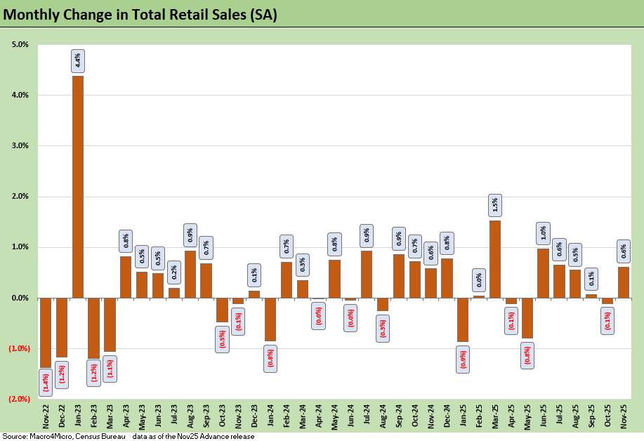The monthly changes to headline retail sales above show a moderate November bounce as holiday spending got off to a solid start. Total retail sales rose 0.6% MoM in November which is more consistent with the 3½–4% holiday growth that trade groups and card networks are seeing. We still see the 2025 retail sales activity as modest in real terms given still elevated inflation and current dollar reporting, but at least this is the kind of seasonal lift is something we had not really seen earlier in the quarter.