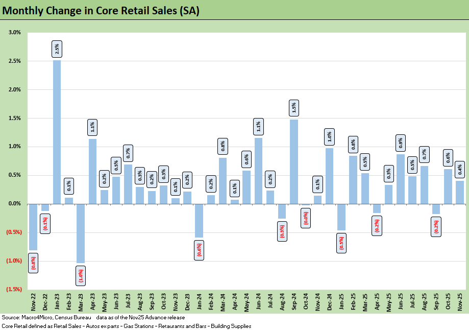 Overall, the +0.4% in core is still a positive print and bodes well for the close of 2025 and that retail report. However, we remain cautious about the near-term outlook given the nuance of holiday vs. staple spending divergence and the continued shift toward value-seeking behavior. We see this as supportive of late-cycle positioning as consumers look to stretch strained balance sheets on the low end, but at least for now they are keeping holiday spending intact.