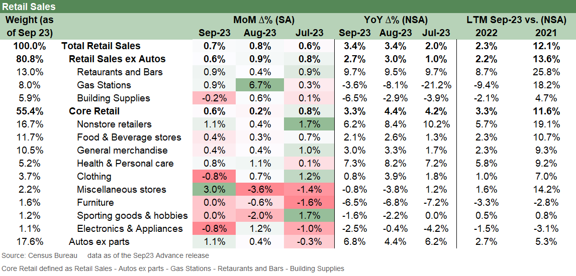 The Retail Sales number is not making life any easier for UST curve bulls and those calling for the consumer to crack. We see continued steadiness in numbers for September in Retail sales ex-Autos while Autos ex-parts also turned in very strong numbers as consumers keep on buying despite rising financing costs. Nonstore Retailers posted a favorable sequential variance with Restaurants and Bars literally chugging along.