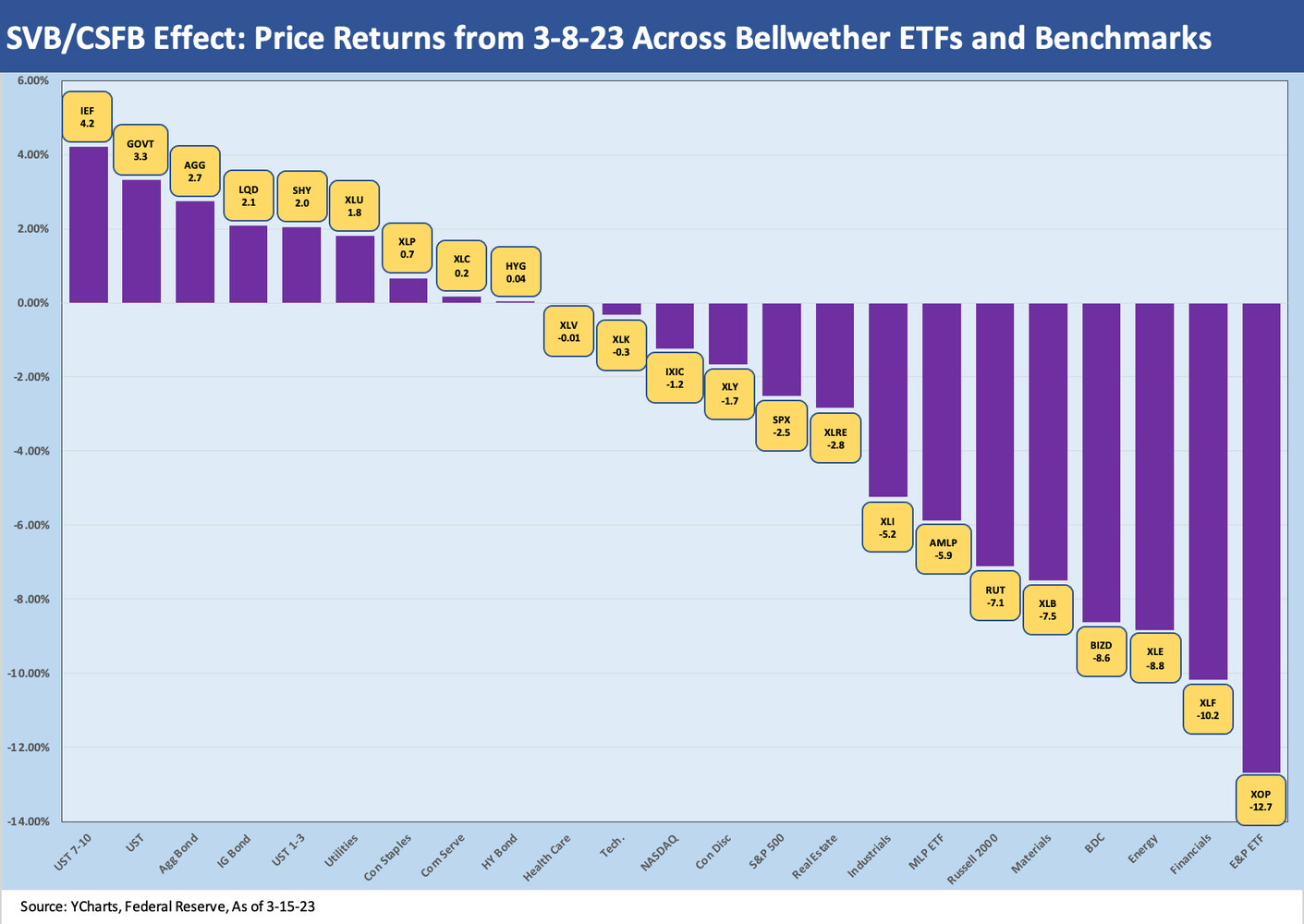 The above chart plots the return since March 8 for a range of ETFs and broader benchmarks. The winner was duration on the UST declines, and we see fixed income ETFs in the Top 5 spots with HY barely edging into the positive zone after ending March 14th on the negative side. As part of this update, we added two more ETFs to our usual list vs. what we do in our weekly (see Footnotes and Flashbacks: Week Ending March 12, 2023). As a reminder, IEF is the 7-10Y UST ETF and SHY is the 1-3Y UST ETF. Way over on the right side of the bar chart we see XOP on the bottom as oil plunged. Meanwhile, Financials were hammered by developments in the bank sector and most notably SVB and CSFB. The more diversified XLE was 3rd from the bottom. BDC saw the strain of recession fears, less upside from the floating rate feature, and concerns around small and microcap loan quality under the scenario of tighter credit and softer demand for a range of markets.