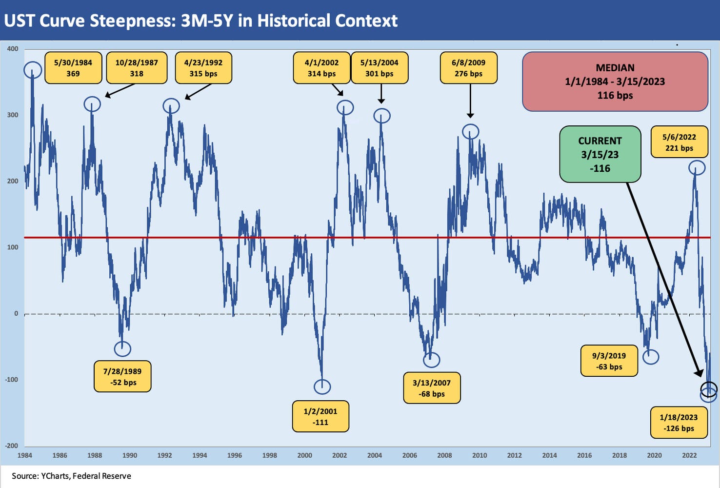 The 3M-5Y has not quite moved so much with the 3M UST more resilient and still somewhat wrapped around the Fed’s policy on the short end. The 5Y UST has moved quite a bit, however, as noted in the earlier bar chart, and the inversion is hanging around just below the sharpest inversion since the Volcker inflation fighting years (not shown here). The 3M to 5Y negative slope still trumps the Jan 2001 peak inversion of -111.