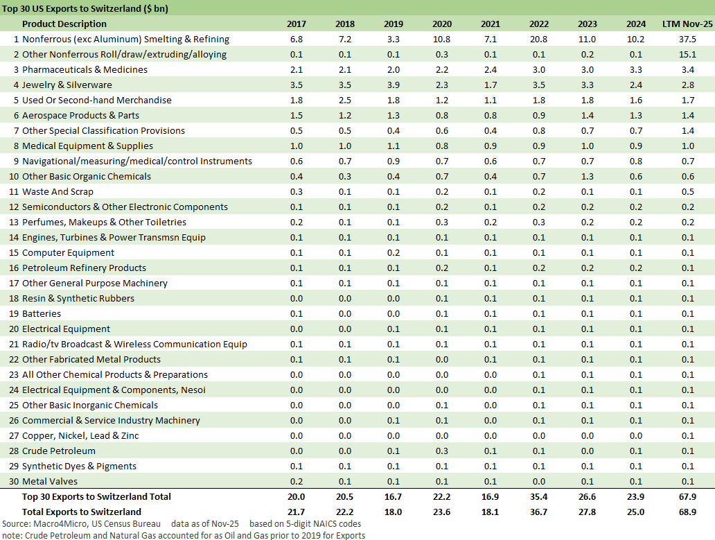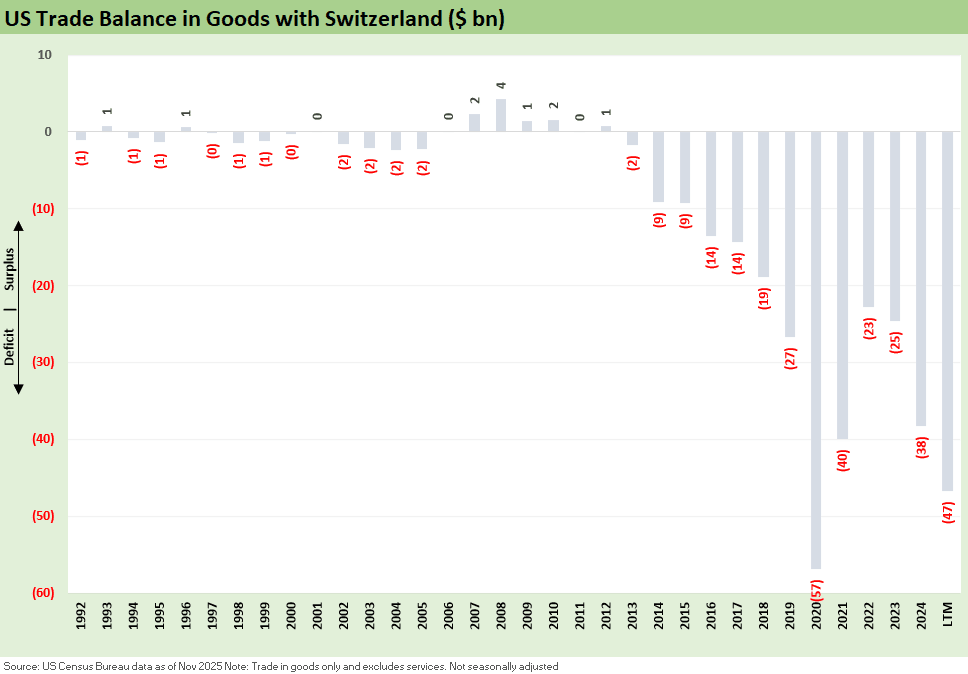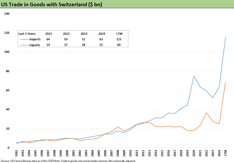 Switzerland made the top 10 trade partners on an LTM basis, ranked #1 in terms of the increase in total trade volume (imports + exports), and the move to a 39% tariff caught a lot of headlines as Trump said the then-Swiss President (female) “rubbed him the wrong way.” (A rarity for Trump to be upset with strong women).