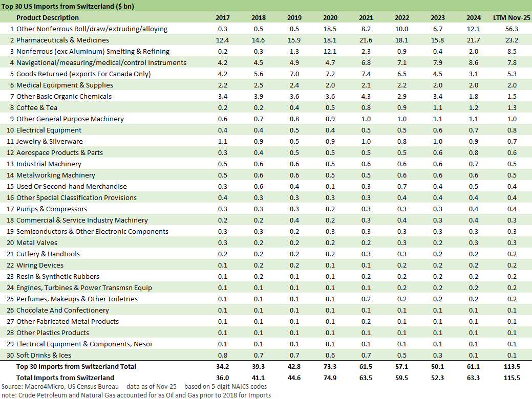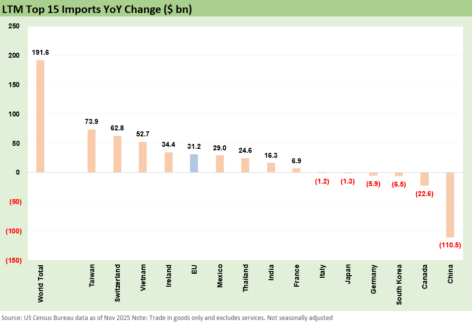 The above chart shows the leaders in YoY import deltas with only Taiwan ahead of Switzerland (see US-Taiwan Trade: Risks Behind the Curtain 2-1-26).
