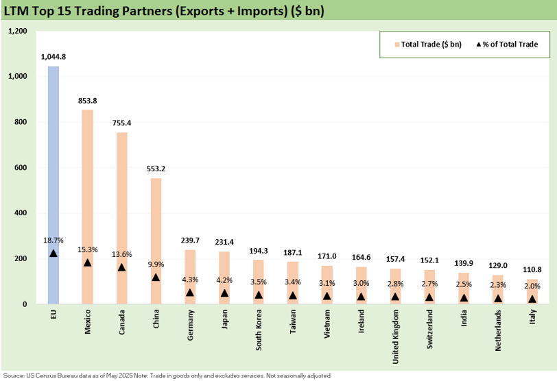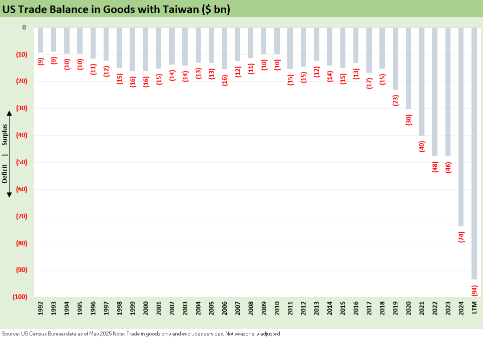 The above chart shows the rankings of trade deficits using annual rates and the most recent LTM. We see Taiwan at #6 (#5 by nation excluding EU as a bloc). That is two notches below Vietnam (see US-Vietnam Trade: History has its Moments 7-5-25). Taiwan was hit with a 32% assigned tariff on Liberation Day but Trump’s famous chart showed them as deserving a 64% tariff. That 64% starting point included a very strange equation to get there. The decision to haircut that level to 32% does not alter the fact that such a number is still an unprecedented rate in the modern capital markets era (see Reciprocal Tariff Math: Hocus Pocus 4-3-25, Reciprocal Tariffs: Weird Science Blows up the Lab 4-2-25).