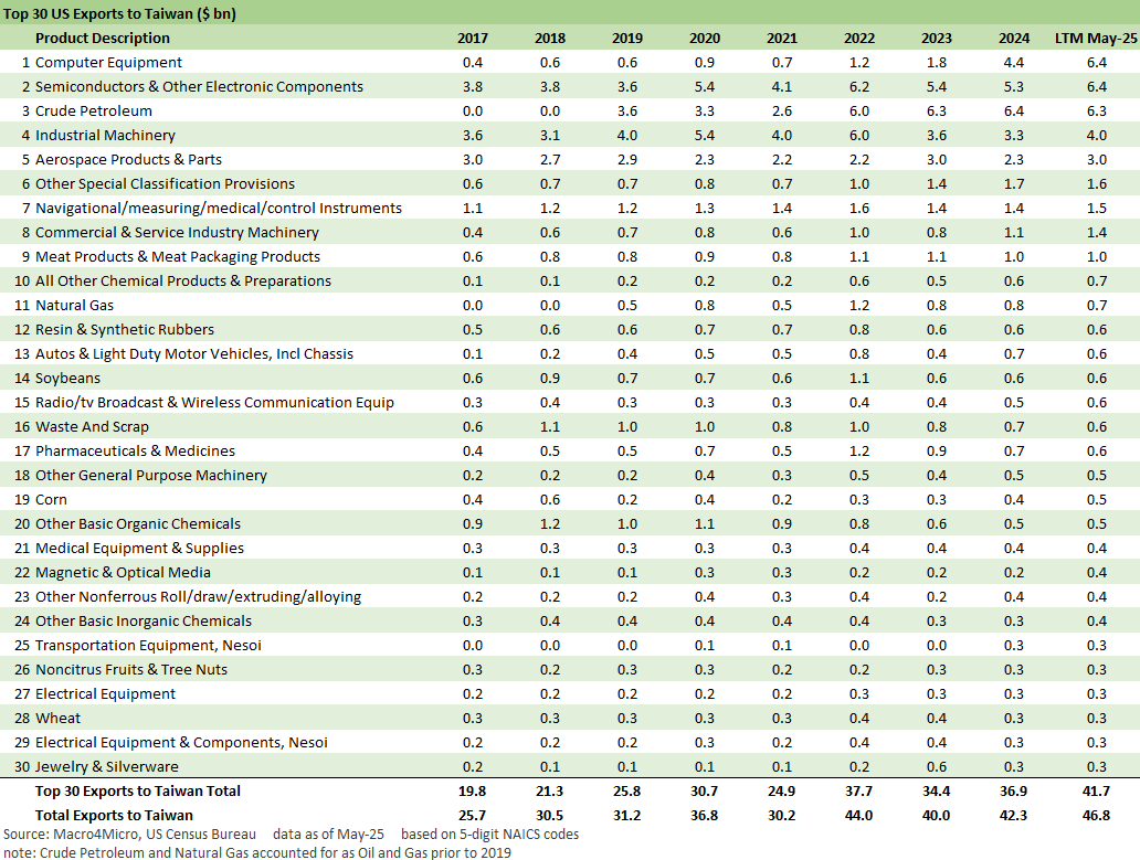 The above chart details the export product mix from the US to Taiwan. It is a well-diversified mix from the US side, and there is very little reason to expect any retaliation from the Taiwan side given their geopolitical dependence on the US. The defense spending decisions by Taiwan on US weapons systems will likely loom larger in the grand Trump plan, but it will be the US buyer paying the tariffs on imports – not Taiwan – regardless of what Trump says. (Yes, we will keep repeating that).