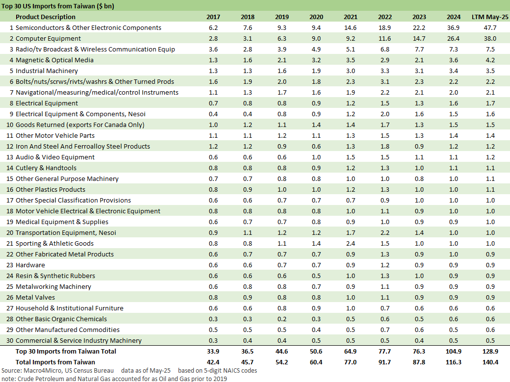 We break out the US-Taiwan import and export details below and give some top-down context on the trade volume history. The high value-added trade flows up the ante on trade policy risks with Taiwan. The list shows a lot of imports that so far are slated to come with very high tariffs attached as the market awaits Trump’s final tariff number. The US buyer will need to write tariff checks to customs. The dollars come from the US side despite the recurring Trumpian lie that the “seller pays” and the US “takes in money” from the trade partner selling nation.