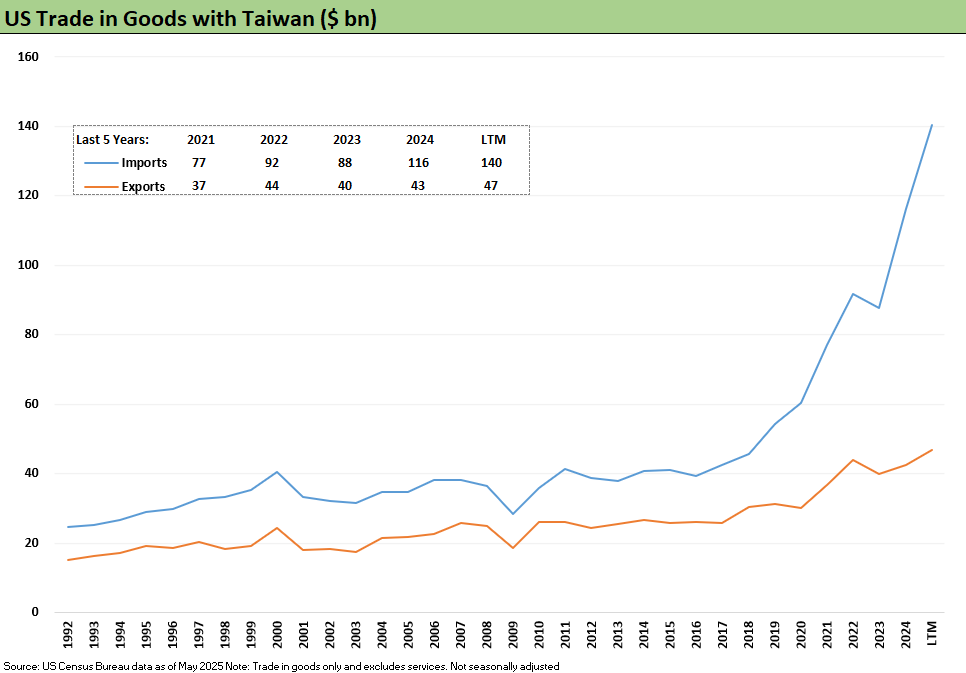 We wrap with the time series since 1992 for Taiwan imports and exports, and the steep moves in imports got a notable start during Trump 1.0 and never really looked back.