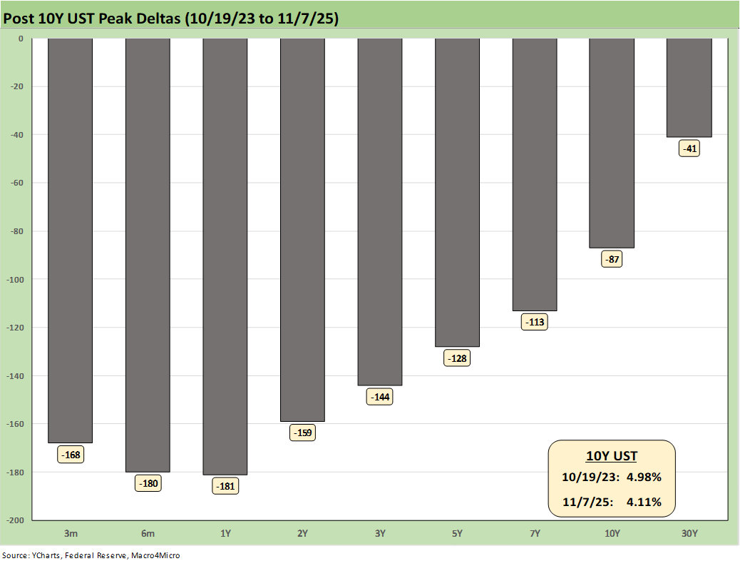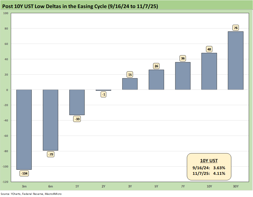 The above chart updates the running UST deltas from the recent low point in the post-tightening cycle reached in Sept 2024 (9-16-24) when the 10Y UST (10-19-23) dipped to 3.6% around the first -50 bps easing. At the very least, the 3.6% on 10Y UST (after the Sept 2024 easing) offers some hope to the UST flattening bulls. Of course, that flattening did not last.