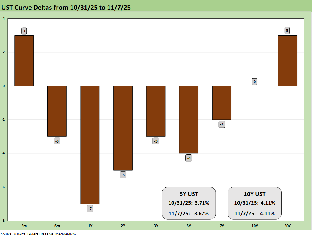The UST action out to 30Y from last week posted a relatively mild move of +3 bps as highlighted in other charts below. The reality is that a UST steepener remains a threat with inflation not easing and UST supply pressures remaining higher across the longer horizon despite the tariff revenue. Trump’s announcement of $2,000 tariff checks for “not rich” people this weekend was an unusual variable in the debt reduction promise.