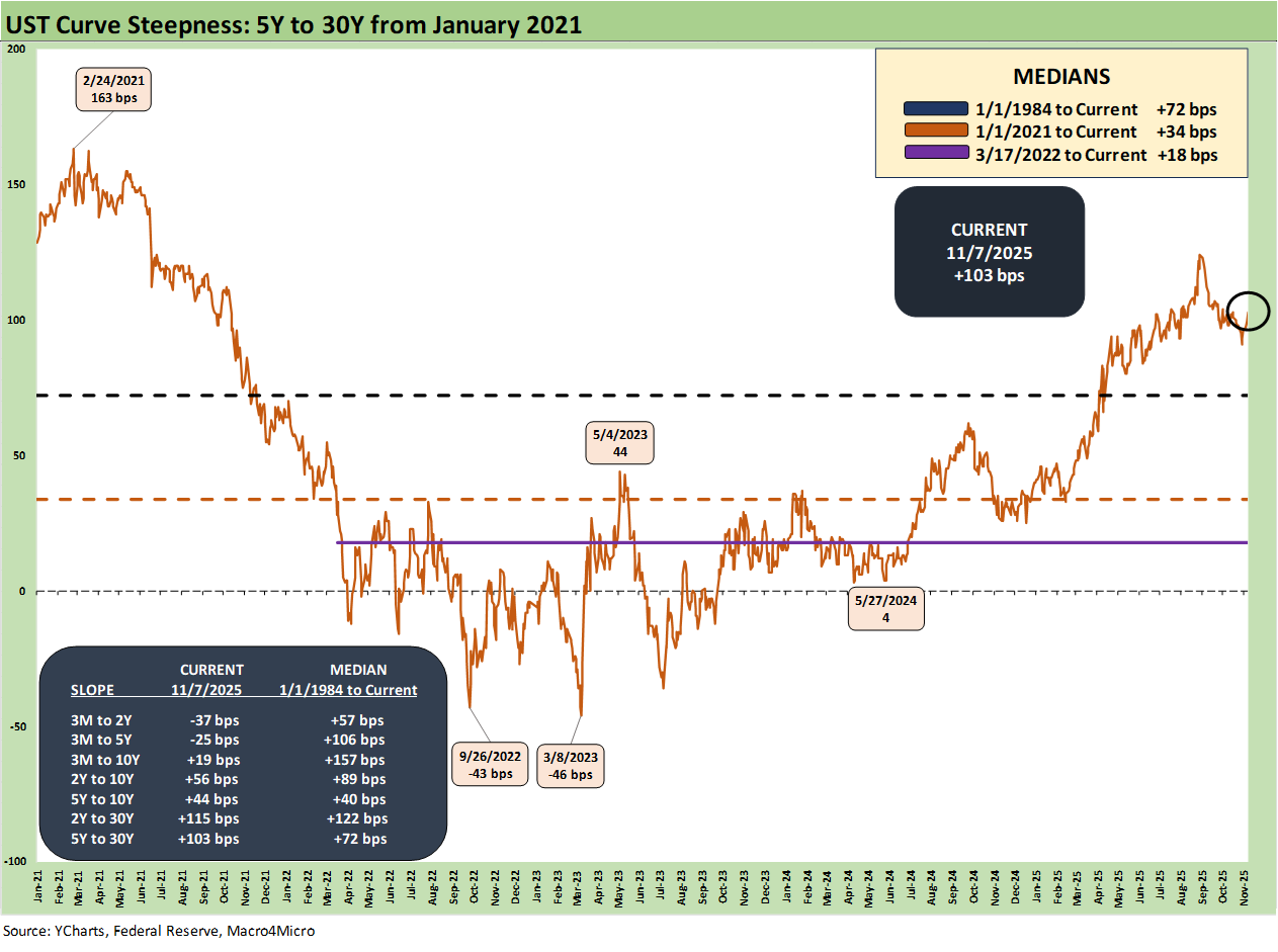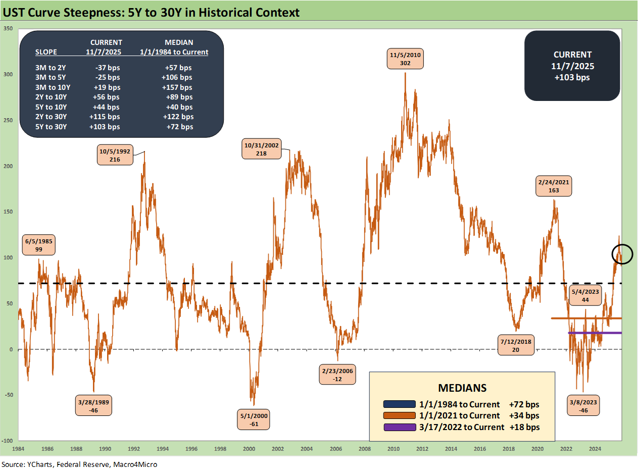 The above chart plots the 5Y to 30Y slope from 1984 for a read on the current shapeshifting potential ahead. For the 5Y to 30Y, the current +103 bps is above the long-term median of +72 bps as the 30Y has lagged the 5Y move during 2025 as detailed in the earlier charts. That relationships shows ample room for steepening from current levels with FOMC easing more likely and subject to the ability of the 30Y to move higher.