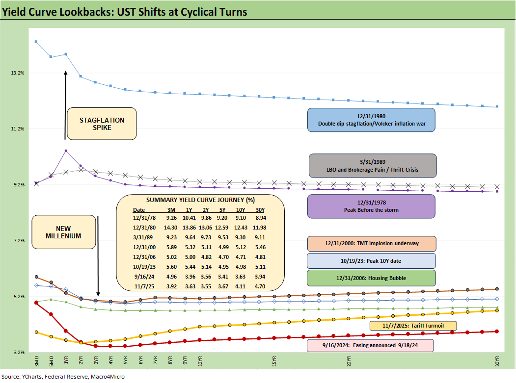 The above chart frames today’s rates amid the wild ride from the Oct 2023 peak (10Y UST) down across the bull flattener into year-end 2023 and then into the easing actions and rally of Sept 2024. Then came the ensuing bear steepener that is evident in the journey to November 2025. We break out some numerical UST deltas in the box.