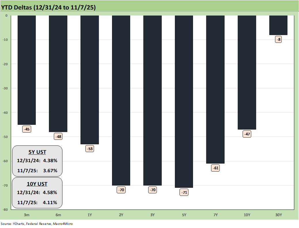 The above chart updates the YTD UST deltas. We see how the bull steepener has paid off for bond returns in YTD 2025 with the 7 bond ETFs we track all in positive return range YTD (see Market Commetary: Asset Returns 11-9-25).
