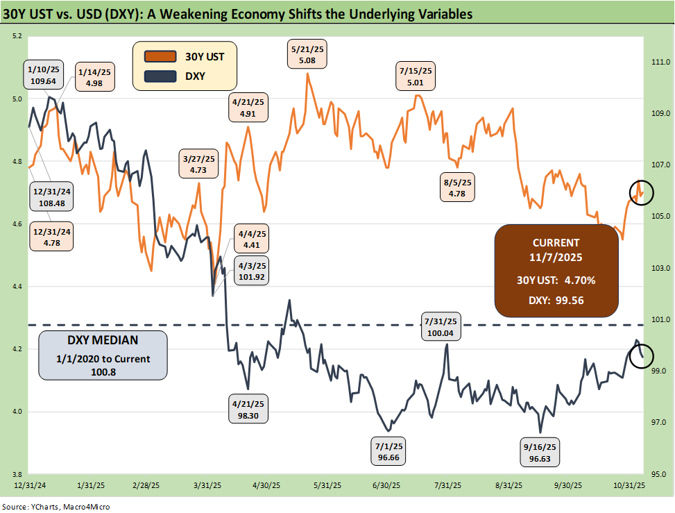 The 4.11% from the Friday close underscores the stubbornness of the long end when the market is hoping for 1 more cut in 2025. The expectation of weaker payrolls saw a setback for UST bulls when ADP weighed in with more constructive commentary. 3Q25 earnings also did not disappoint the fundamental economic story in the large cap corporate sector. Small business remains a wildcard in the age of high tariffs, and that requires more data from the BLS.