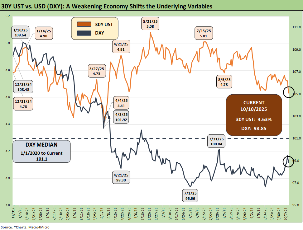 This past week saw the dollar firm up to 99.45 at close on 10/9 and then retreat again on 10/10 as noted in the chart. That came after Trump threatened 100% tariffs on China. Pre-China announcement, the recent rebound was being attributed to FOMC actions and post-meeting commentary not signaling a hyper easing move – at least until Trump gets “his guy” in the seat and more like-minded people in leadership positions.