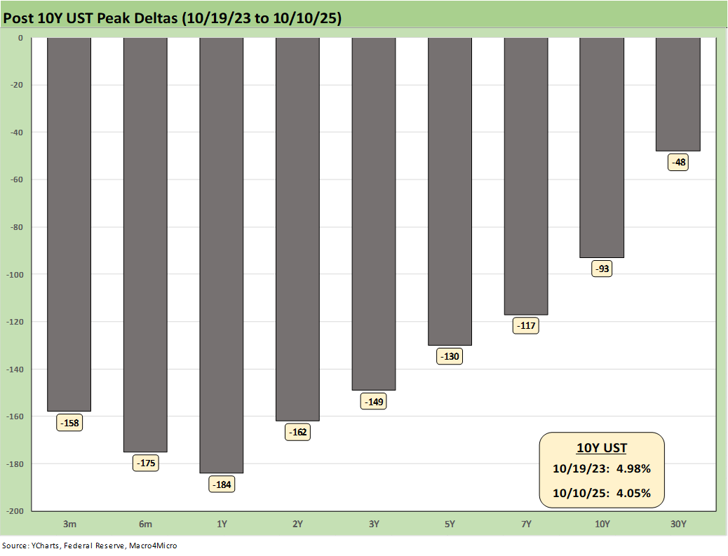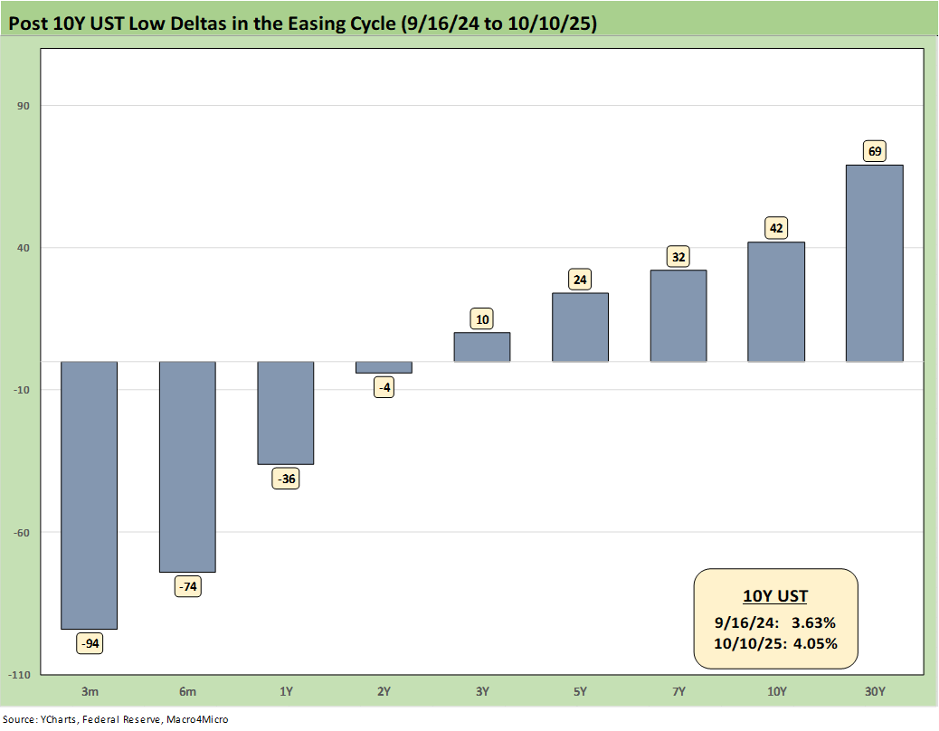 The above chart updates the running UST deltas from the recent low point in the post-tightening cycle reached in Sep 2024 (9-16-24) when the 10Y UST (10-19-23) dipped to 3.6% around the first -50 bps easing. The latest UST move shaved some more bps off the UST deltas. At the very least, the 3.6% on 10Y UST offers some hope to the UST flattening bulls as the FOMC gears up for more easing heading into year end.