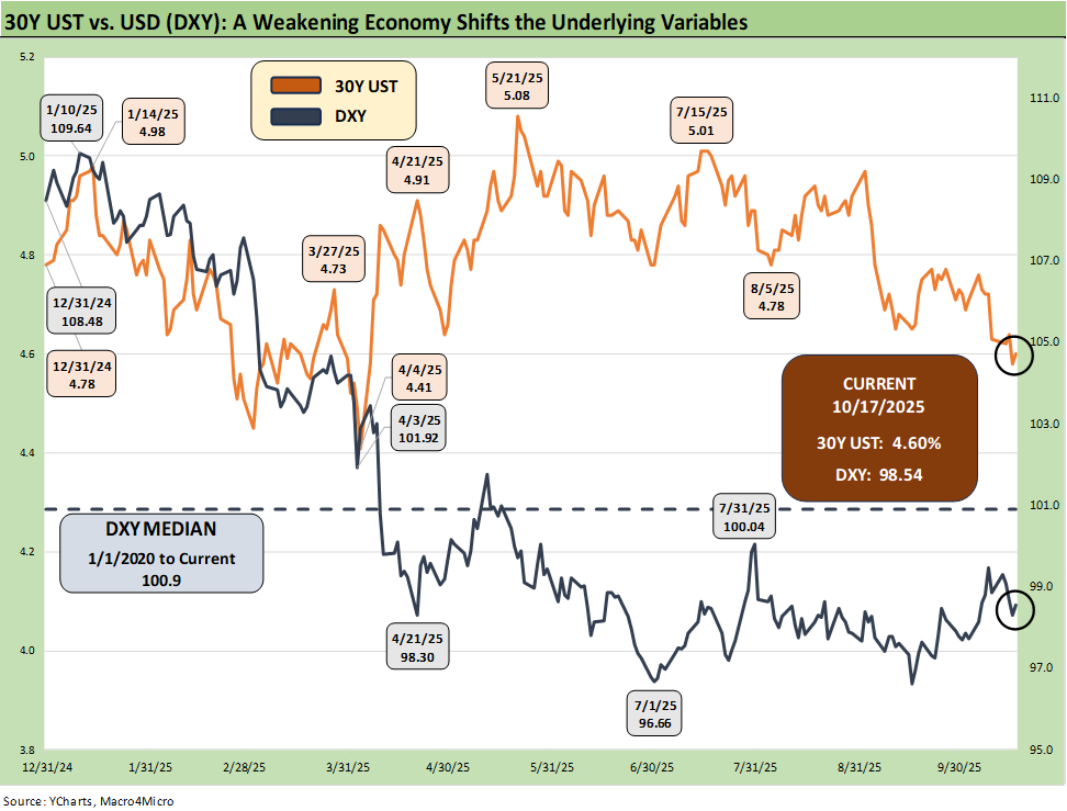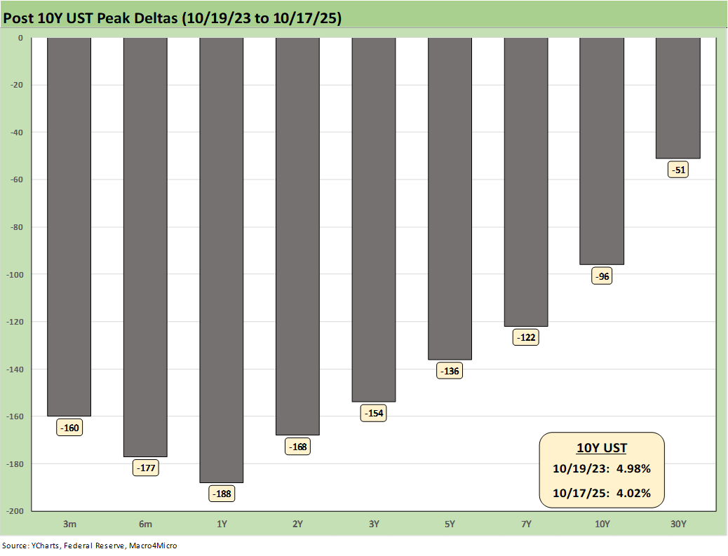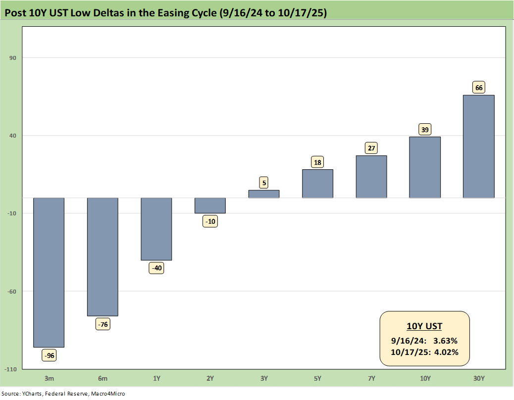 The above chart frames today’s rates amid the wild ride from the Oct 2023 peak (10Y UST) down across the bull flattener into year-end 2023 and then into the easing actions and rally of Sept 2024. Then came the ensuing bear steepener that is evident in the journey to Oct 2025. We break out some numerical UST deltas in the box.