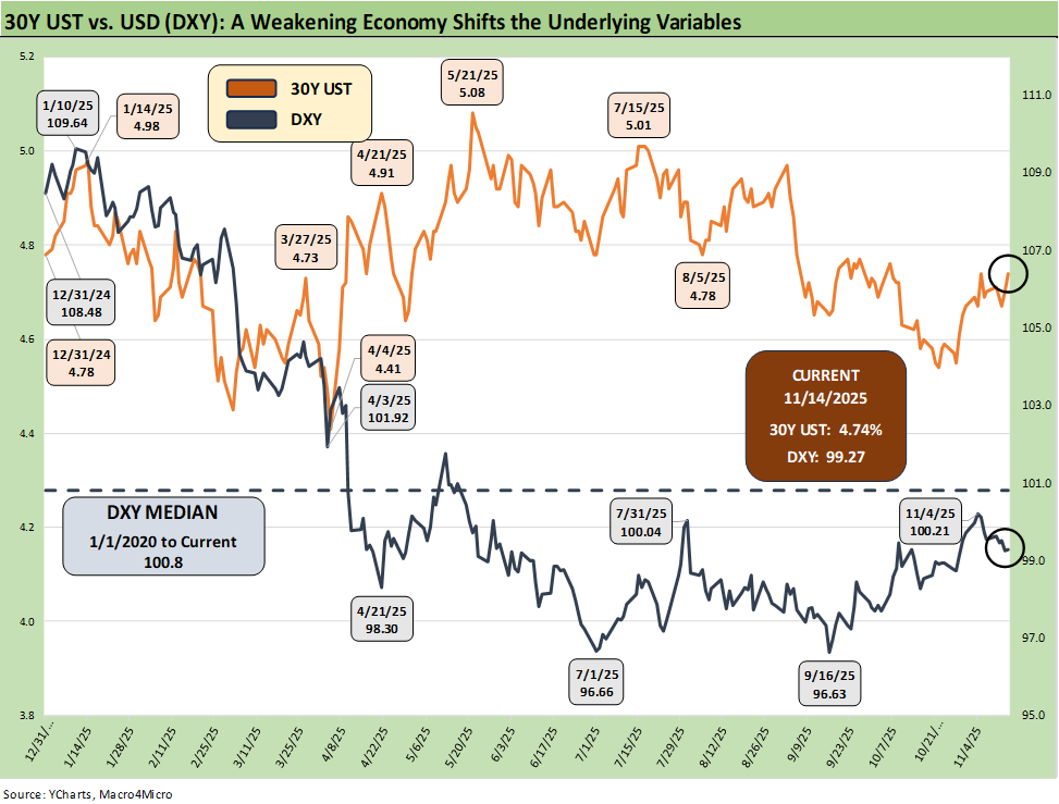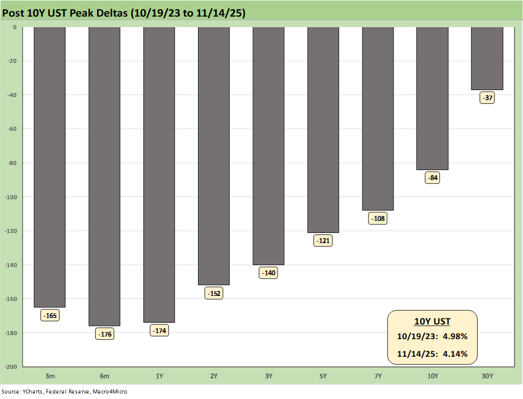 The above chart frames today’s rates amid the wild ride from the Oct 2023 peak (10Y UST) down across the bull flattener into year-end 2023 and then into the easing actions and rally of Sept 2024. Then came the ensuing bear steepener that is evident in the journey to November 2025. We break out some numerical UST deltas in the box.