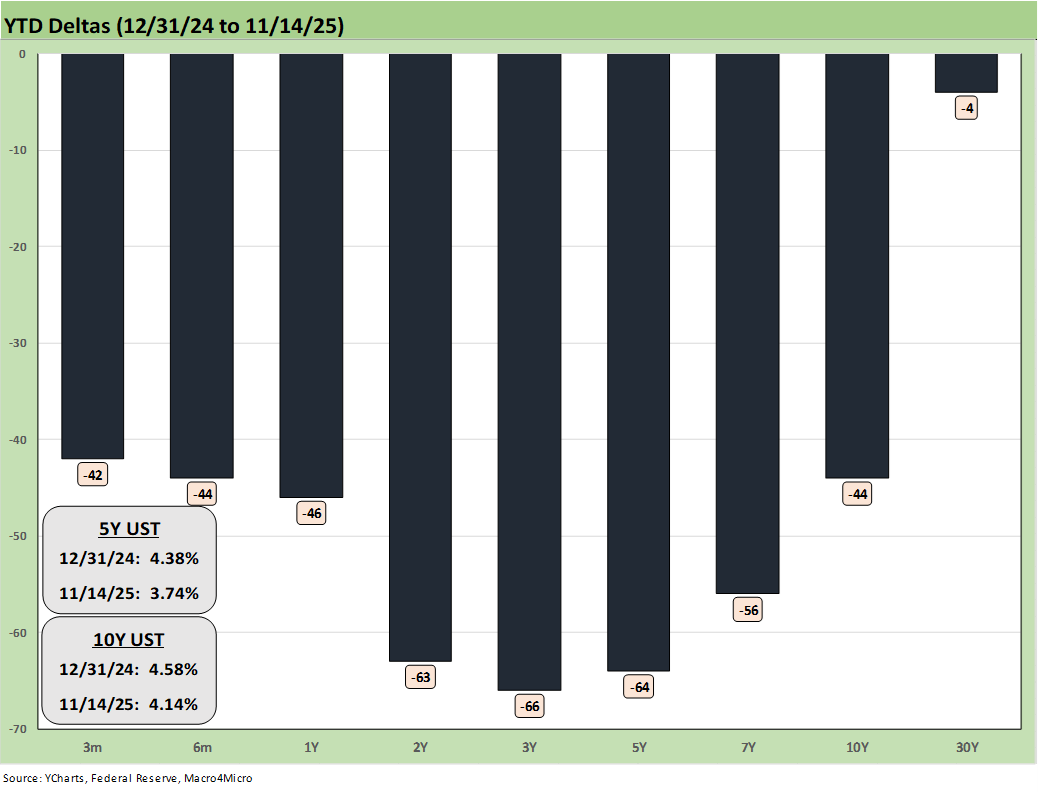 The above chart updates the YTD UST deltas. We see how the bull steepener has paid off for bond returns in YTD 2025 with the 7 bond ETFs we track all in positive return range YTD (see Market Commentary: Asset Returns 11-16-25).