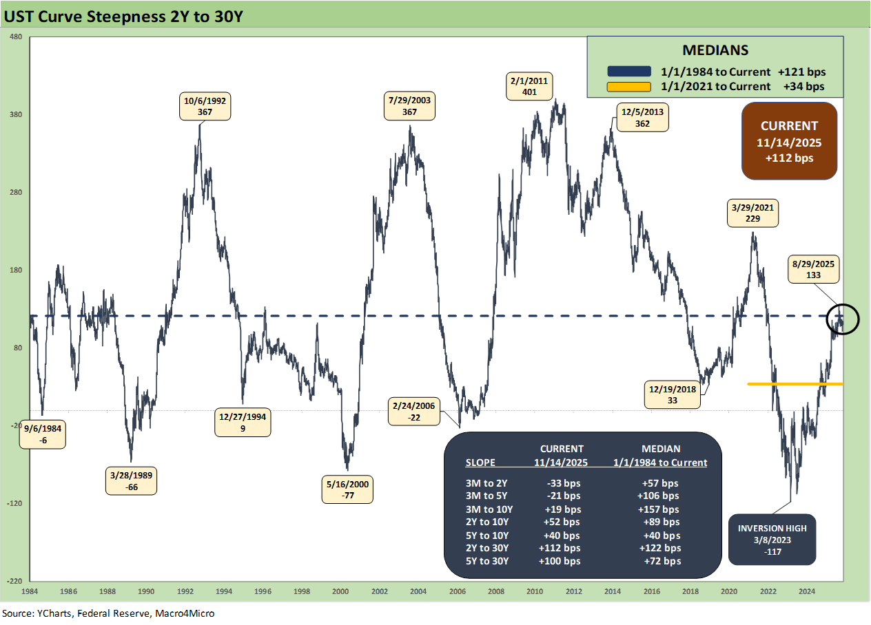 The above chart plots the 2Y to 30Y slope from 1984 for a read on the current shapeshifting potential ahead. For the 2Y to 30Y, the current +112 bps is just below the long-term median of +122 bps as the 30Y has lagged the 2Y move during 2025 as detailed in earlier charts. That relationship shows room for steepening from current levels with FOMC easing more likely and subject to the ability of the 30Y to move higher.