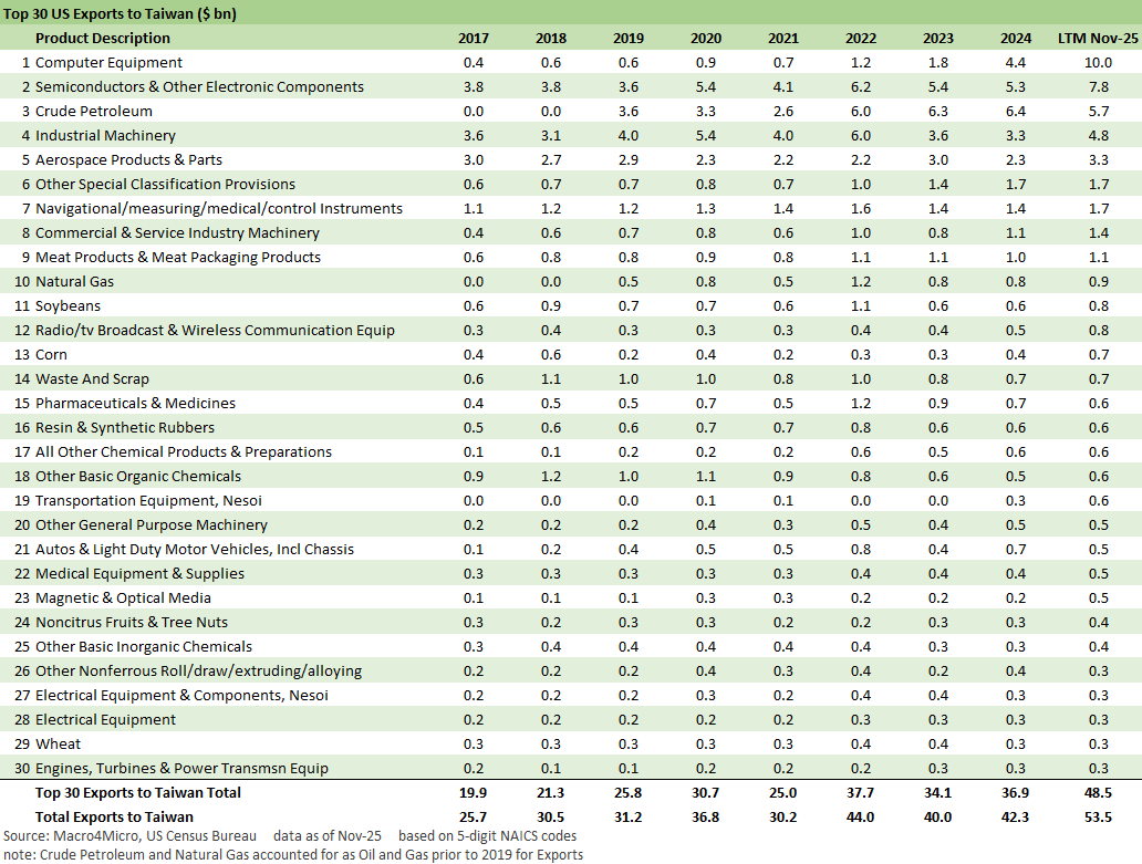 The above chart updates the goods trade deficit in US-Taiwan trade. As covered in the import product line chart below, the increase is concentrated in Computer Equipment and Semiconductors & Electronics.