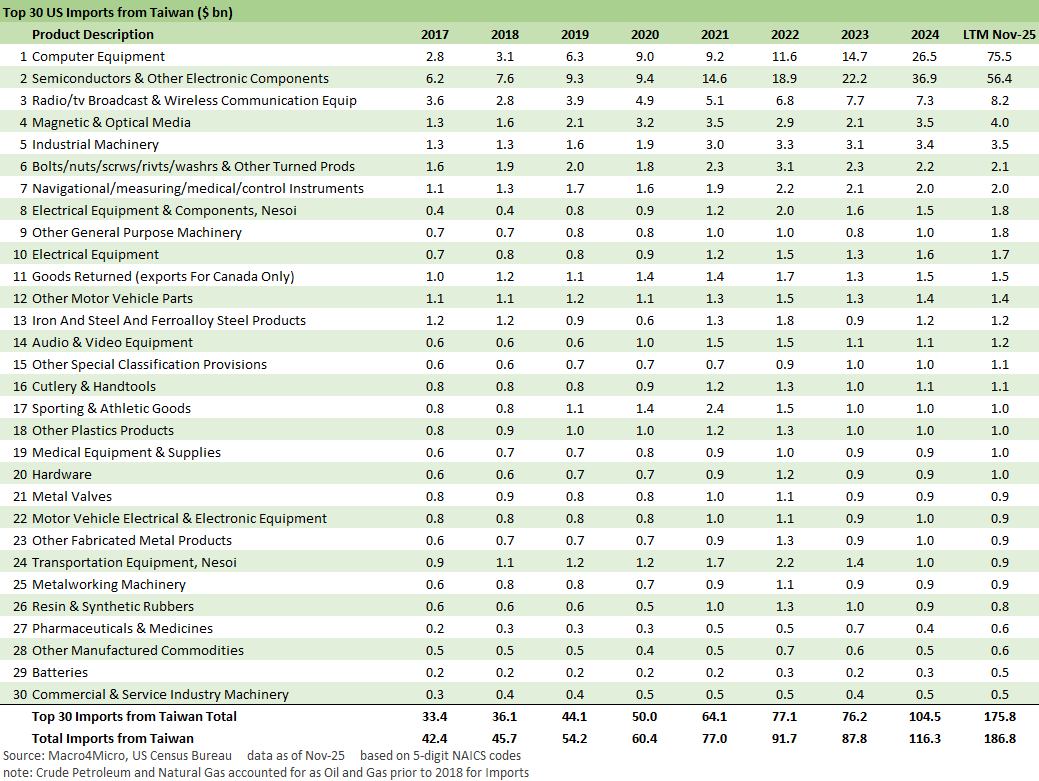 The above chart replicates the list of leading trade partner import deltas we broke out in the broader top-down trade review (see Trade Deficits: Math Challenge 1-30-26). Taiwan posted the highest running YoY import increase ahead of Switzerland and Vietnam. The biggest decline was China. The rise in Taiwan imports can be taken as a good sign for the US economy. After all, when demand is high, good things are happening here. How the tariffs flow into profit margins, costs, prices etc. is an industry-by-industry, case-by-case analysis.