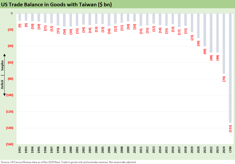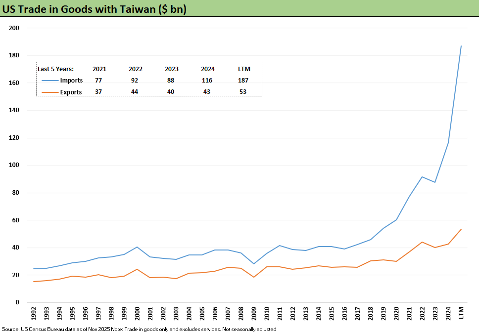 We look at the sustained climb in the US-Taiwan goods trade deficit through LTM Nov 2025 as records were set during Trump 1.0, under Biden, and now are soaring. The LTM import spike was led by a near tripling of Computer Equipment and more than a 50% rise in Semiconductors.