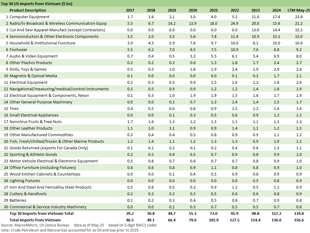 We also see a heavy base of “Cut and Sew Apparel” and Footwear” in the Top 10 imports from Vietnam. As an aside, Vietnam was the largest supplier to Nike as we looked at this past week (see Mini Market Lookback: Eye of the Beholder 6-28-25). The main issue on Apparel and Footwear tariffs is those items certainly show up in household budgets. That makes it a regressive tax.