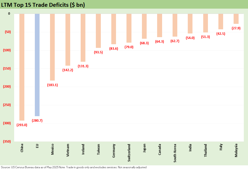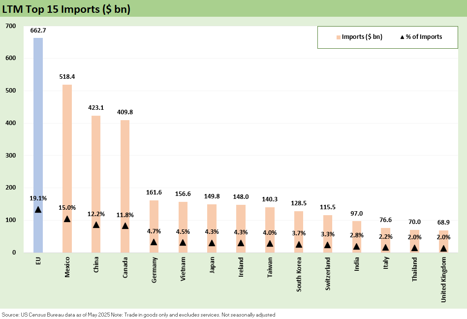 The above chart updates the Top 15 importers into the US on an LTM basis. We list the EU as a single trade partner and separately list individual EU countries. We see Vietnam at #6 (#5 by nation).
