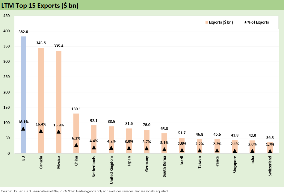 The above chart updates the Top 15 exports. Vietnam does not make the list. It is worth remembering as we head into the home stretch on “reciprocals” and new Section 232 tariffs that the Top 3 export markets (EU, Canada, Mexico) comprise over half (52.2%) of US exports. As Trump makes noise about the US “holding all the cards” we should remind him we must be exporting a lot of those card decks.