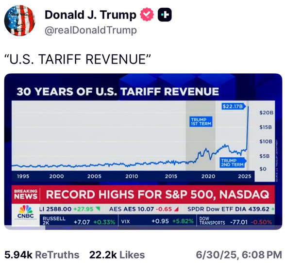 The chart above is another “Truth” posted by Trump. We would argue it is mislabeled. It could easily say “cash payments made by importers/buyers that end up the US Treasury.” Another version is “trend line in regressive taxes paid by US-based businesses and consumers.” The spike seen on the right side of this time series will go much higher.