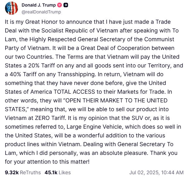 The latest tariff deal sets the stage for a wave of activity this coming week if the deadline holds or at least starts the process of the “letters” being sent out the trade partners. As a reminder, these “reciprocals” are not literally “reciprocal.” In contrast, they are about limiting trade deficits.