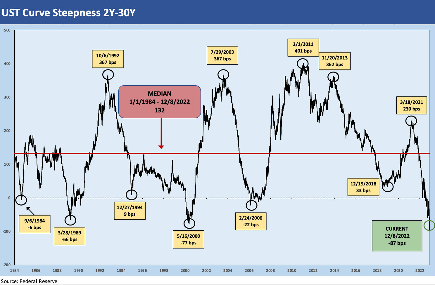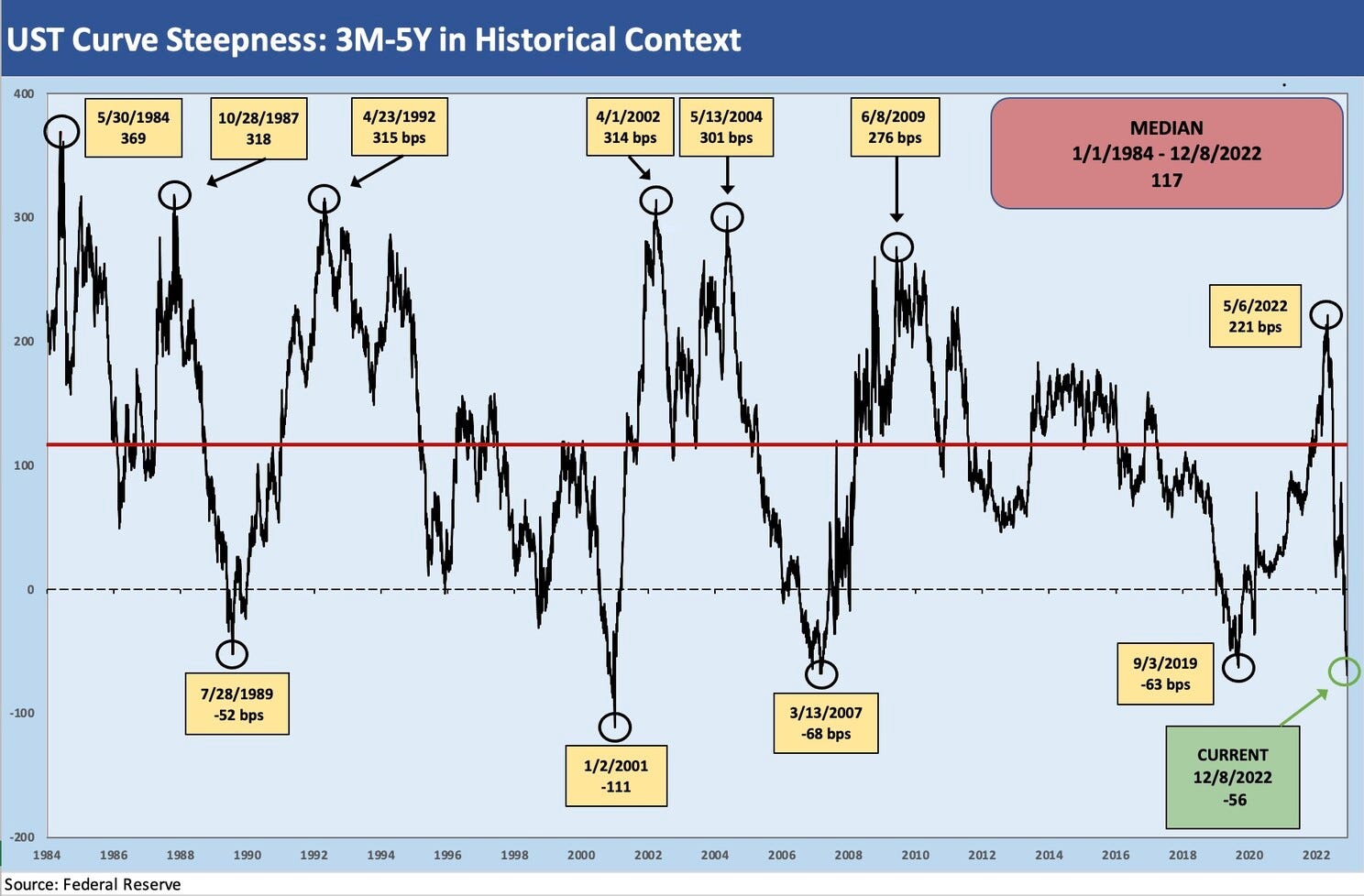 The 2Y-10Y makes a statement on inversion with the most inverted curve since the wild period of Volcker inflation fighting way back during the double dip recession period. As an example, the 2Y-10Y had hit -241 bps in 1980. The above chart covers the period from 1984, when the market had returned to some remote level of normalcy, through Dec 8, 2022 (end of day UST quotes). The -82 bps inversion this week stands out across the cycles covered.